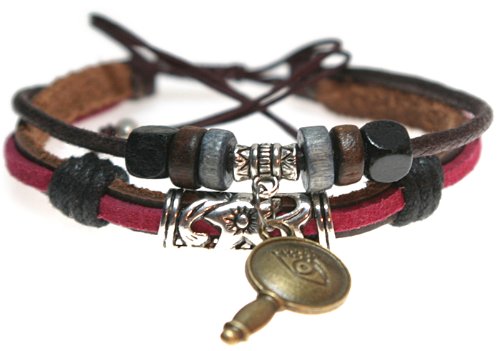 Red and brown leather zen bracelet has muli-strands embellished with silver bali-style beads and wooden beads. There is an eye design brass drop. Adjustable sizing fits 5.5 to 9 inches. Simply pull ends to adjust. Silver nuggets decorate the end of the cords. Arrives in a silver foil linen gift box with a silver bow ready for gifting.Available at Amazon Check Price Now!