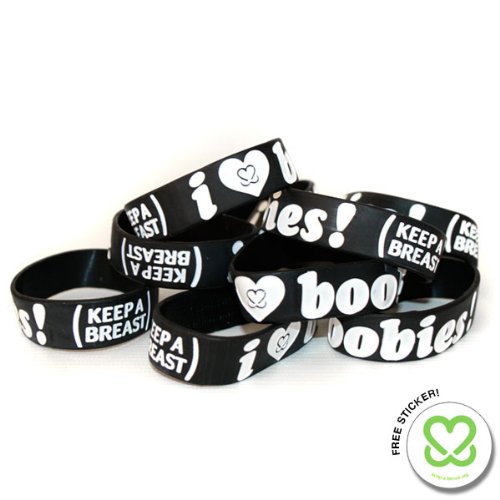 The Keep A Breast Foundation I Love Boobies Silicone Bracelet. 50% of the sale of this bracelet benefits Keep A Breast's prevention and education programs. Keep A Breast's "I Love Boobies" Campaign is a unique national campaign that develops a new approach and positive style of communication about breast cancer. The campaign is meant to encourage young people to target their breast health. The T-shirts and bracelets act as an awareness-raising tool, allowing young people to engage and start talking about a subject that is scary and taboo and making it positive and upbeat.
